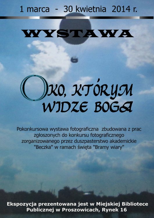 Miejska Biblioteka  Publiczna w Proszowicach zaprasza do obejrzenia pokonkursowej wystawy fotograficznej pod nazwą „Oko, którym widzę Boga”, zbudowanej z prac, które zostały zgłoszone do konkursu fotograficznego zorganizowanego przez Duszpasterstwo Akademickie „Beczka”  w ramach święta „Bramy Wiary” obchodzonego w Krakowie w dniach 25-28 kwietnia 2013 r. Prace opowiadają o wierze swoich twórców.