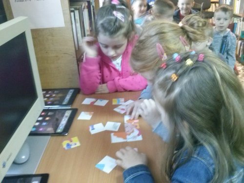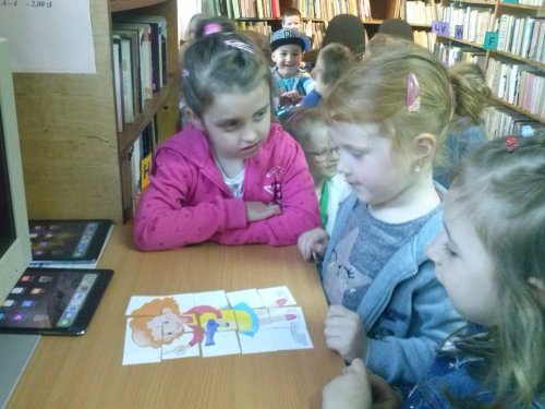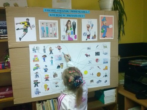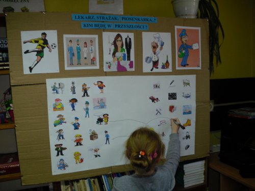 Na początek wspólnie rozwiązywaliśmy krzyżówkę, dzieci oglądały ilustracje przedstawiające rożne profesje i słuchały wierszyków o zawodach. Dzieliły się swoimi wyobrażeniami na temat tego, kim chciałyby zostać w przyszłości. Uczniowie mieli również okazje poznać dostępne w bibliotece kolorowe książki przedstawiające pracę w rożnych zawodach.
