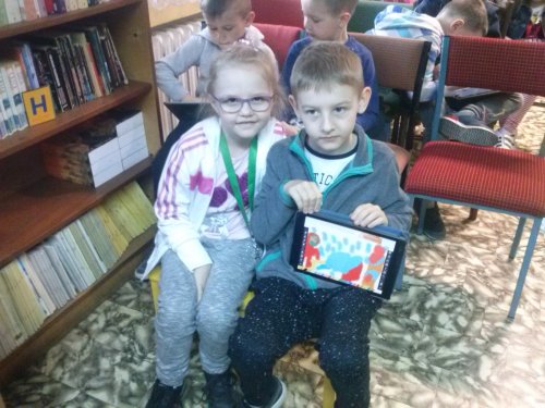 Dzieci otrzymały słodkie upominki, naklejki oraz kolorowanki o zawodach, które pięknie pomalowane można teraz zobaczyć w bibliotece.